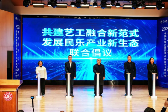 大会现场由相关承办、协办单位负责人:乐改委会长王鹏、交大自动化与感知学院院长杨博、上音民乐系主任刘灏、交大人文学院书记齐红、民乐企业代表上海戴氏琴弦制作社总经理戴卫,联合发起“共建艺工融合新范式,发展民乐产业新生态”联合倡议,旨在整合上海音乐学院的艺术底蕴、上海交大的科技实力、中国民族管弦乐学会的行业资源以及民族乐器企业的实践经验,倡议中国民族乐器行业未来应围绕乐器声学与数字化、智能制造与品质评估、人工智能辅助教学及演奏、乐器全生命周期设计等关键技术方向展开深度交叉与学科融合,进一步助力文化强国建设和民乐的国际影响力提升。