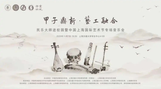11月7日晚19点30,2025 甲子鼎新·艺工融合—民乐大师进校园暨中国上海国际艺术节专场音乐会在上海交通大学学生中心A100厅精彩上演。本次活动由中国民族管弦乐学会、上海交通大学党委宣传部、上海交通大学学生艺术团联合主办,上海交通大学自动化与感知学院、上海交通大学大人文学院、上海音乐学院民乐系联合承办,上海吾调艺术发展有限责任公司、上海戴氏琴弦制作社、北京钧天坊古琴文化艺术传播有限公司、北京思綦生文化传播有限公司等联合协办,搭建了交大师生近距离对话民乐大师、沉浸式感受国乐魅力的桥梁,并面向社会公益开放预约参加。演出当晚,400余人的音乐厅场面热烈,掌声不息。