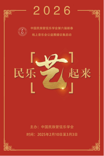 为弘扬中华民族音乐文化,团结联络广大民乐工作者,丰富人民群众在春节期间的精神文化生活,中国民族管弦乐学会经过精心筹备,计划在2026年新春佳节之际(2026年2月10日至3月3日)推出“民乐‘艺’起来——中国民族管弦乐学会第六届新春线上音乐会公益展播”。