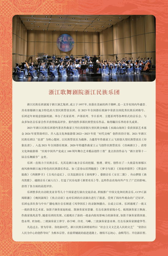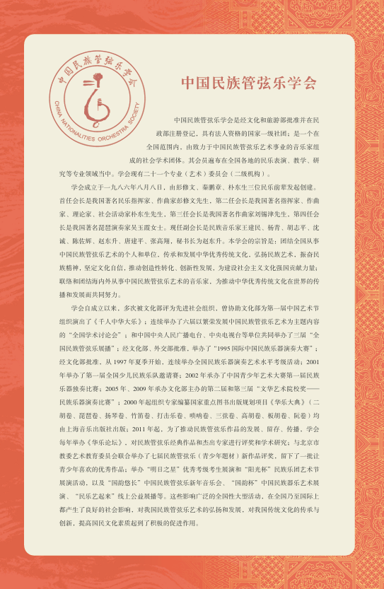 五载春秋,五迎新年,在中国民族管弦乐学会和国家大剧院的通力合作下,在中央和地方各级民族乐团的积极响应下,《国韵悠长系列新年音乐会》迎来第五次演出,正如吴玉霞会长所说,这个精心打造的音乐品牌,展现的正是“民乐人之家”的温情与憧憬。在成功举办央地四团联合演出、京津冀三地四团联合演出、城市民族乐团五团联合演出后,本场音乐会迎来长三角四家民族乐团——上海民族乐团、江苏省演艺集团民族乐团、浙江歌舞剧院浙江民族乐团、安徽乐团民族管弦乐团的联袂呈现。