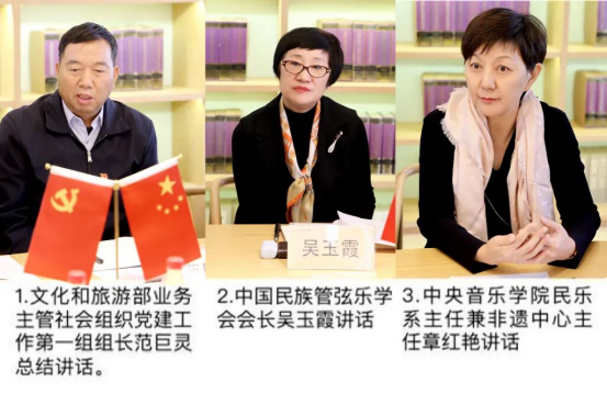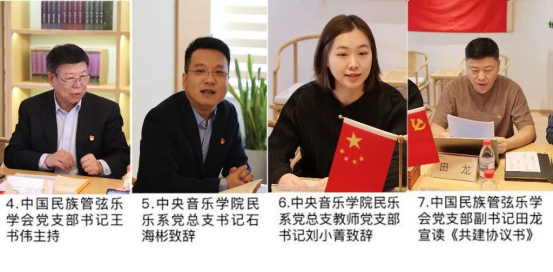 文化和旅游部业务主管社会组织党建工作第一组组长范巨灵莅临指导。中国民族管弦乐学会会长吴玉霞、党支部书记王书伟,中央音乐学院民乐系主任章红艳,系党总支书记石海彬、教师党支部书记刘小菁以及双方党支部成员、党员代表出席仪式。仪式由王书伟书记主持。